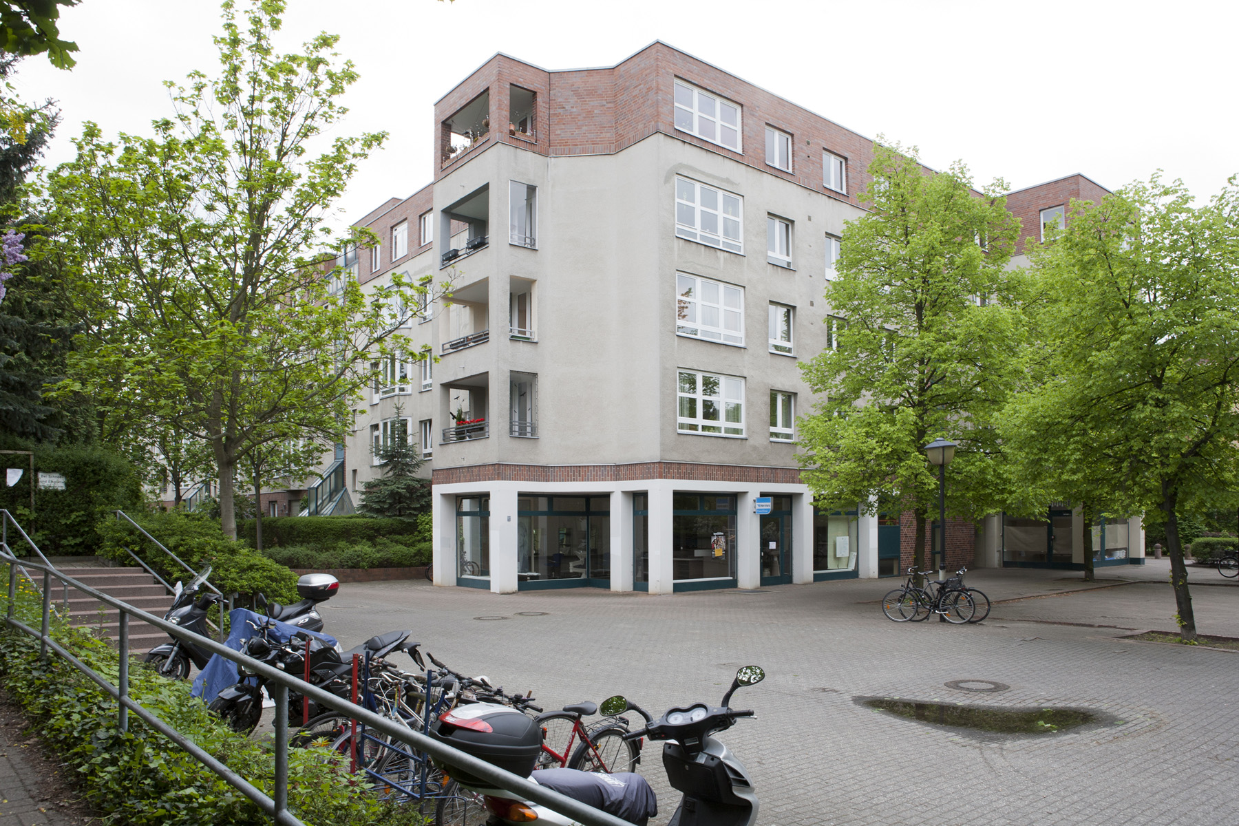 Die städtebauliche Einordnung der Neubebauung erfolgt durch großzügige Raumbildung, bezogen auf die unmittelbare Nachbarbebauung mit übergreifender Grünplanung, gemeinsame Frei- und Spielflächen sowie Platzausbildungen und Mietgärten als Abschluss zum benachbarten Kleingartengelände.